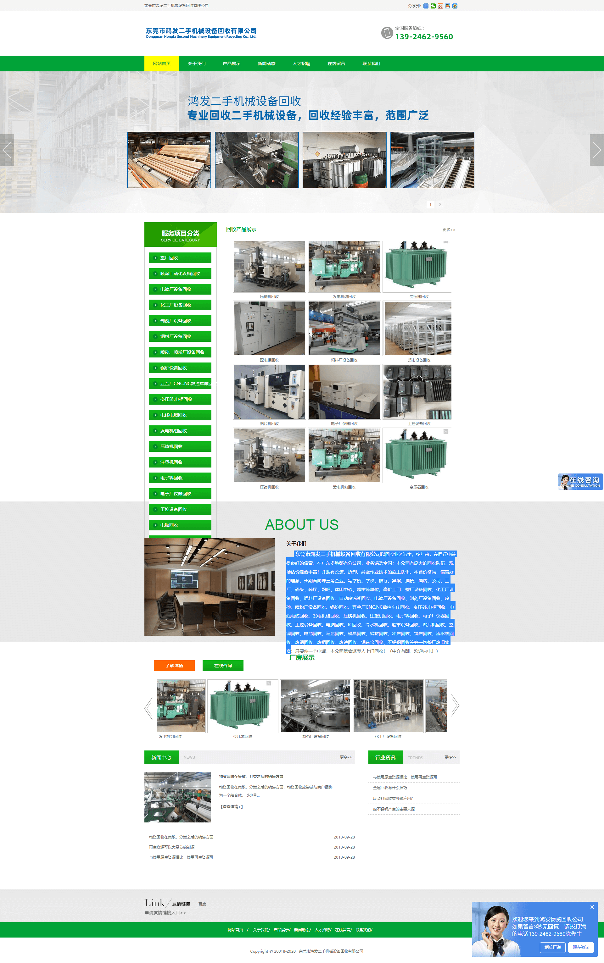 東莞市鴻發(fā)二手機械設備回收有限公司以回收業(yè)務為主,多年來,在同行中獲得良好的信譽。在廣東多地都有分公司,業(yè)務遍及全國;本公司有龐大的回收隊伍,現場估價經驗豐富!并擁有安裝、拆卸、高空作業(yè)技術的施工隊伍。本著價格高,信譽好的理念,長期面向珠三角企業(yè)、寫字樓、學校、銀行、賓館、酒樓、酒店、公司、工廠、碼頭、餐廳、網吧、休閑中心、超市等單位,高價上門:整廠設備回收、化工廠設備回收、飼料廠設備回收、自動噴涂線回收、電鍍廠設備回收、制藥廠設備回收、噴砂、噴粉廠設備回收、鍋爐回收、五金廠CNC.NC數控車床回收、變壓器.電柜回收、電線電纜回收、發(fā)電機組回收、壓鑄機回收、注塑機回收、電子料回收、電子廠儀器回收、工控設備回收、電腦回收、IC回收、冷水機回收、超市設備回收、貼片機回收、空調回收、電池回收、馬達回收、模具回收、鋼材回收、沖床回收、銑床回收、流水線回收、廢鋁回收、廢銅回收、廢鐵回收、鋁合金回收、不銹鋼回收等等一切整廠廢舊物資。